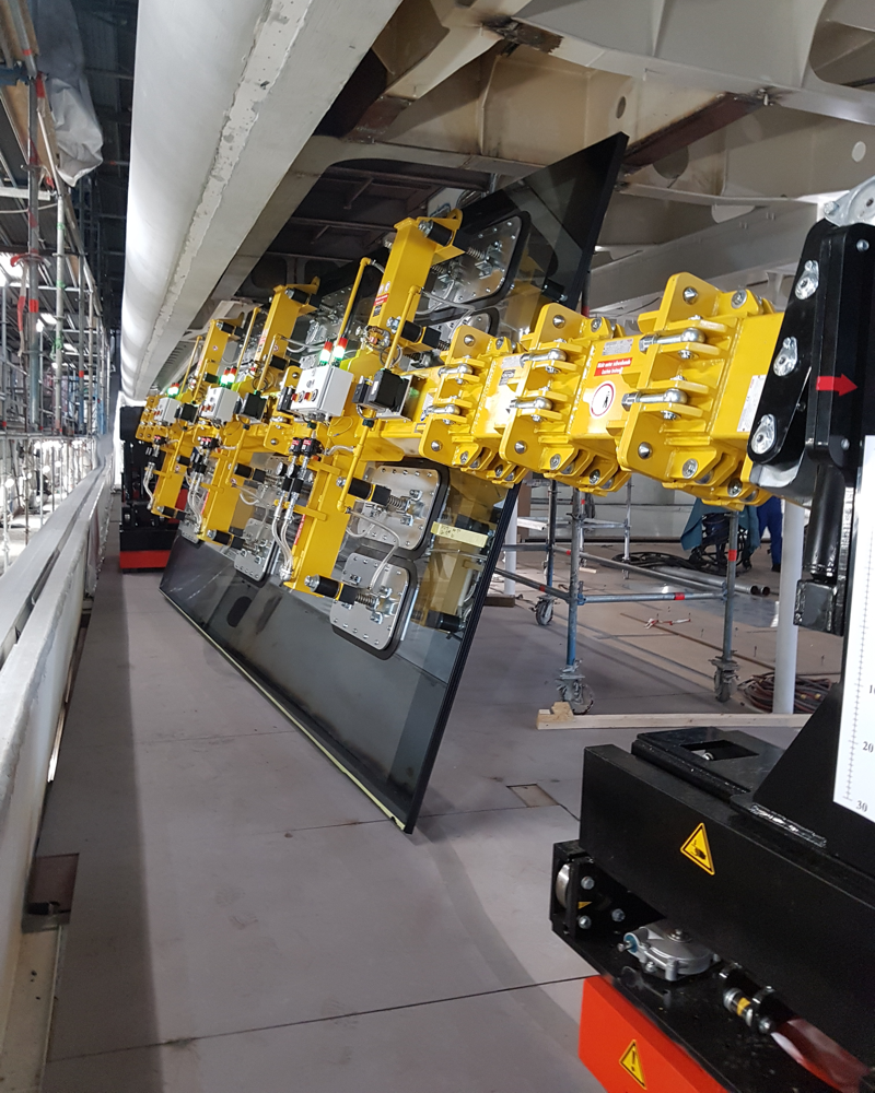 Der Transport und das Einsetzen der Glaselemente verlangte eine feinfühlige und exakte Steuerung. Hier wurden 2 Glasboy 5300 über Funk von einem Spezialisten mm-genau gesteuert.